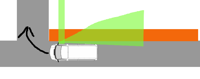 Da ich eigentlich sonst fas nur Fahrrad fahre, bezeichne ich mich mal als extrem aufmerksamen und und rücksichtsvollen Autofahrer. Jetzt mit diesem Wagen hab ich aber echt ein Problem, das ordentlich umzusetzen. Das größte Problem dabei ist der Tote Winkel, der beim Rechtsabbiegen eine Rolle spielt. Natürlich gibt es einen toten Winkel Spiegel am Wagen der auch extrem wichtig ist. Aber es scheint mir, dass ein anderer Winkel von allen Techniken und Diskussionen völlig außer acht gelassen wird. Oder an meinem Wagen ist etwas falsch eingestellt, was ich nicht glaube, ich versuch das mal darzustellen: