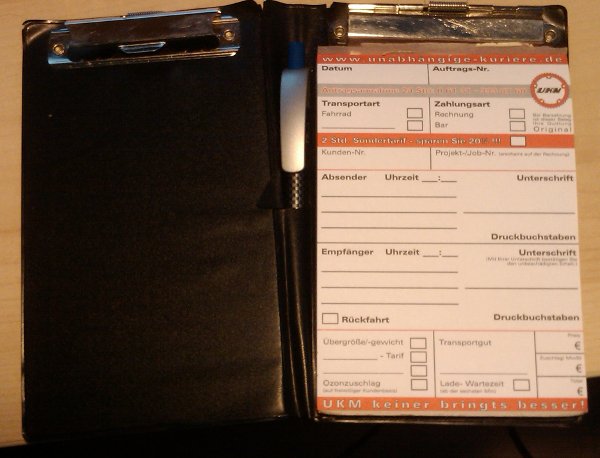 ich kann meine touren abends als pdf abrufen. mehr als was wir auf dem server pro kopf speichern, wüßte ich mir auch gar nicht zu jeder fahrt zu notieren. wenn die übliche "wannwiewo-kunde ist am rohr"-frage kommt, meistens am funk, selten per telefon, dann grübelt man schnell, erinnert sich -wenn nicht die frage grad ein blackout auslöst - mir schon passiert- und erklärt halt "junge dame, ende zwanzig, brille, kopf kleiner als ich, hat gelispelt, die hat das angenommen, weil der tresen grad nicht besetzt war.." dann ist in den meisten fällen alles geklärt und der kunde weiß, daß es nicht der kurier sondern sein eigener betrieb bescheuert ist