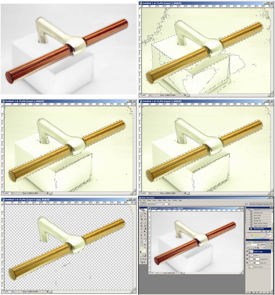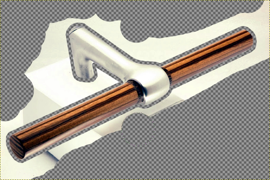 wenn dieser schnelle weg nicht präzise genug klappt, mußt du nach dem ersten schritt das radiergummi nehmen. je nach schärfe der konturen des teils (blende 11 ist für scharfe produktfotos gut) vor seinem hintergrund wählst du einen entsprechdn scharfen oder unscharfen pinsel. irgendwo ansetzen, kurz klicken, kannst du dann mit jeweils erneut gedrückter shift-taste gerade linien ziehen bis irgendwo zum zweiten klick. so ziehst du einen transparenten graben um das teil und kannst den rest dann hinterher mit riesenpinsel wegradieren.