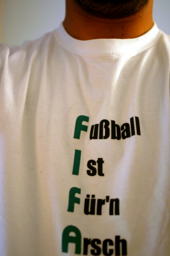 ich hab grad n tshirt an, das ich und ein kumpel uns ääh zur letzten wm oder em haben drucken lassen..