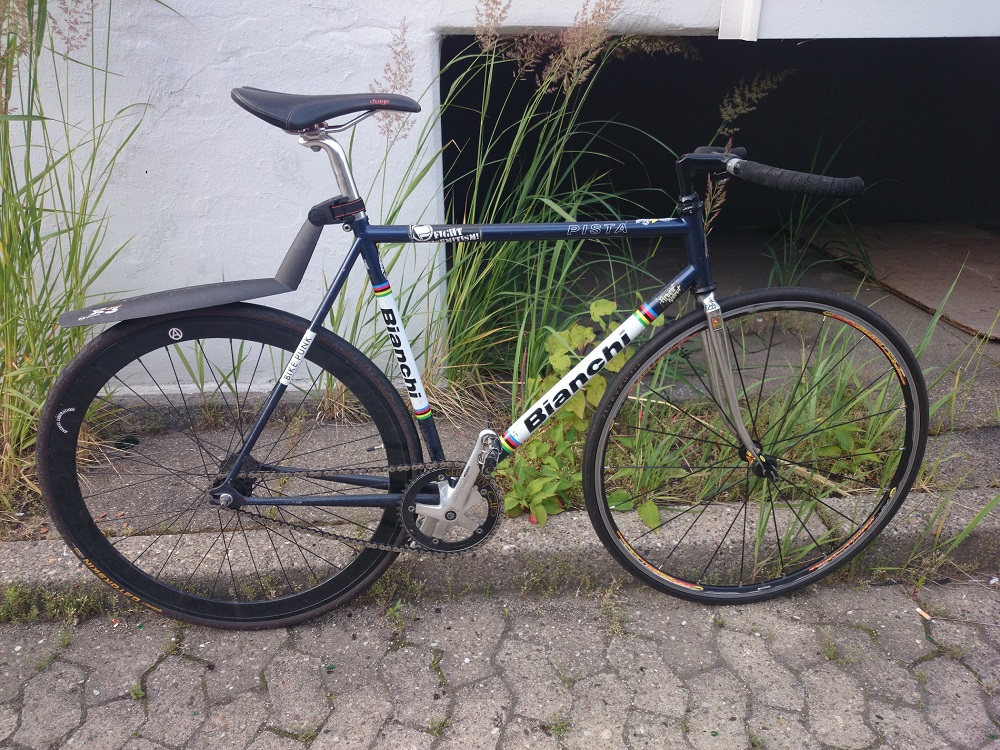 2. Mein Bianchi Pista mit einer silbernen Miche Primato Pista Kurbelgarnitur (48:17), 42 mm tiefe Felgen (der Stabilität zuliebe, nicht dem Aerowahn) mit Sturmey Archernaben (nicht die besten, aber günstig und mit neuen Lagern durchaus zu fahren in der Stadt), momentan Mavic Aksium Laufrad vorne, weil das eben benannte Lagertauschen vorne anstand. Eine, wie ich finde, wunderschöne Stahlrennradgabel (die originale ist unglaublich nicht schön!!), einem Charge Stattel, den ich persönlich ganz gut finde, für den Preis und irgendein Vorbau mit irgendeinem abgeflexten Lenker aus meinem Fundus