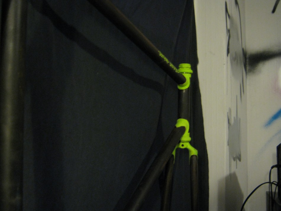 Nebenbei kann ich euch noch mal von meinem schönen unbekannten Rahmen erzählen, dessen Klarlack gerade trocknet und aus dem mein neues Fixie wird. Als Rahmen- und Gabelfarbe habe ich ein leicht bräunliches Mattschwarz gewählt, welches ich mit einem sehr feinem "Metallpad" an manchen Stellen abgeschliffen habe. Da schimmert dann der Stahl durch. Dann kam ueber den gesamten Rahmen eine Art leichtbraune, trotzdem durchsichtige "Lasur". Anschließend hab ich noch die Muffen Grasgruen lackiert und gerade eben mit der ersten Klarlackschicht angefangen. Sieht wirklich sehr schick aus. (Fotos folgen sobald ich eine Kamera zur Verfuegung habe)