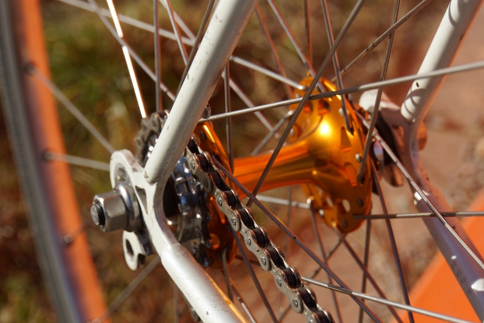 Das beste, von der neuen Kette mal abgesehen, zum Schluß. Eine goldorangene Bahnnabe von BLB, die ich in die vorhandene ital. Alufelge eingespeicht habe, mein zweites selbstgebautes Laufrad, diesmal in nur zweieinhalb Stunden geschafft, und auch mit adäquater Spannung. Das war bei meinem ersten noch nicht so toll und mußte von einem netten Menschen in der Dortmunder VeloKitchen korrigiert werden :patsch: