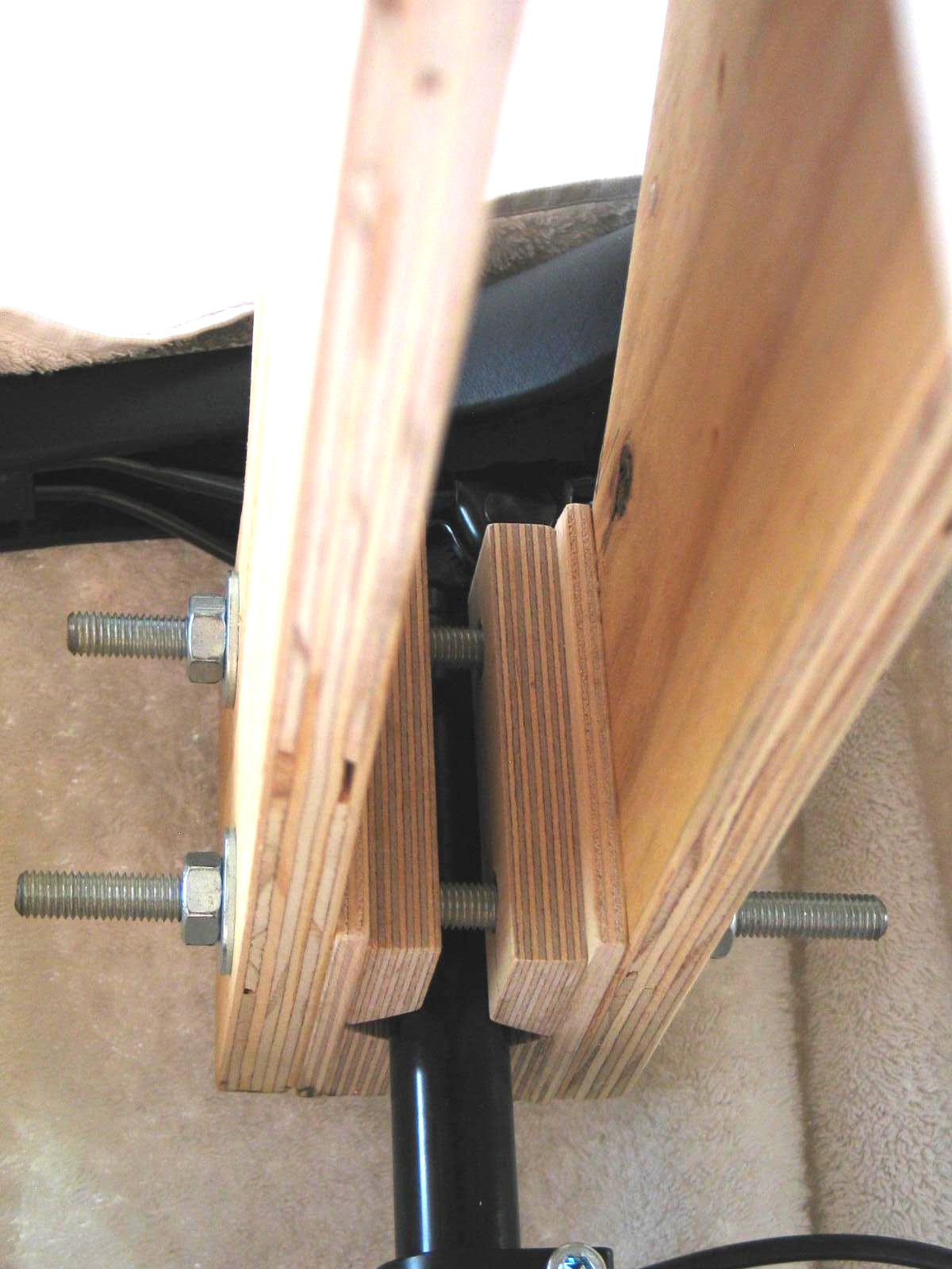 Die Holzwangen arbeiten als Blattfedern, in Ruhestellung mit losgedrehten Muttern und ohne Sattelstütze haben die Prismen in etwa den gleichen Abstand. Beim Einhängen federn die Prismen von selbst um die Sattelstütze, beide Hände bleiben am Fahrrad. Dann hängt das Fahrrad sicher am Sattelkloben und ich kann mich voll auf die Muttern konzentrieren.