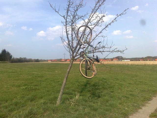 Viele berichteten schon von ihm, aber scheinbar hat ihn niemand wirklich gesehen... jetzt dann doch. Ich präsentiere: der Bahnrad-Rahmen-Baum. Wie man sieht, an ihm wachsen nicht nur Bahnräder sondern auch die ein oder andere Alternativ-Frucht... und für Bahnrad-Rahmen ist grad nicht Saison...