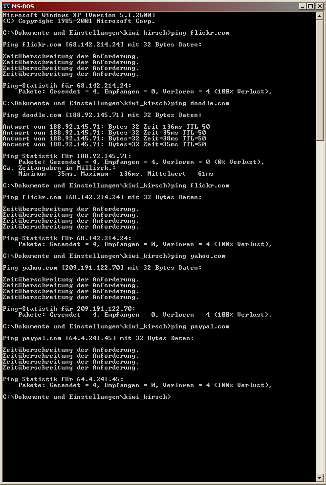 ich komm nicht mehr an flickr.com, ich komm nur noch mit eeeeewig wartezeit an meine yahoo mail, doodle.com antwortet auch erst nach eeewigkeiten.. hab grad mal n paar auf firefox spackende seiten gepingt. HÄÄÄ? wassislos?