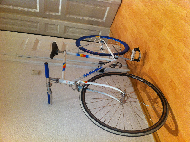 Zunächst wurde mir in Leipzig mein neues ktm mtb ganz dreist abgezockt dann bin ich fett geworden also hab ich mir für n Hunnie beim Kumpel das abgefuckteste Rennrad gekauft und war damit morgens immer Sport treiben.. Eines schönen morgens hat dann 7km von zuhause weg das Pedal meinem Gewicht und meiner Motivation nachgegeben und ist einfach abgebrochen (Altersschwäche). Mich hats meega aufs maul gepackt natürlich direkt vor weiblichem Publikum und ich hatte keine Kohle um es zu reparieren. hab mir dann langsam teile gekauft und weil Minimalismus geil ist und auch bisschen wegen der Hipsterwelle halt gleich mal auf fiexie. Hab auf den ersten Rahmen erstmal aufgebaut. stahl rh 58 (bin 1.80) gemuft völlig unkenntlich was das mal für einer war. Hab alles abgeflext was so abstand jaja steinigt mich ruhig :) Dann hab ich in der bucht n altes aber super erhaltenes Peugeot Rad rh 56 zufällig entdeckt der super zu den gekauften teilen passte. tada! gekauft. der Rahmen ist nicht gemufft und sicher nicht so gut wie "der rote" aber es hat so gut gepasst zu meinen teilen und den roten umlackieren was bitter nötig wäre war genauso teuer.. und den roten mach ich dann als 2. "pro"-fixie wenn ich die gröbsten Fehler schon gemacht hab weiter. Und hab des schicke "Fakenger" dann fürs Cruisen. So der Plan.