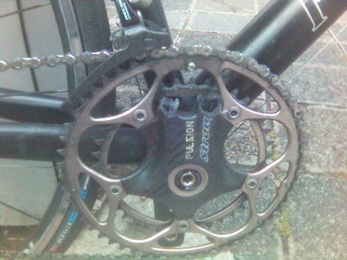 UI! Aus der Kettenblattaufnahme gerissen! Wollten da Jan Ullrich Beine eine 17% Steigung mit 53-11 rauffahren oder ist die Kurbel einfach nur scheiße? :vogel: