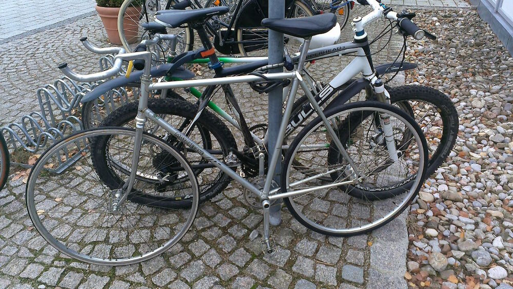 Auf Fahrräder bin ich im Grunde erst seit kürzerem gekommen. Meine Oma hat seit Ewigkeiten ein wunderschönes rot metallic Basso Triathlon Rad, Columbus mit Campagnolo Umwerfern Bremsen und Kurbel, in der Garage stehen. Ein Geschenk von meinem Opa, muss in den 70ern gewesen sein. Seit dem stand das Rad so gut wie unbenutzt in der Garage und sammelte kleine Kratzer. Vor 2 Monaten habe ich dieses Rad geschenkt bekommen, da es jedoch 'etwas' zu klein für mich ist, meine Oma 1,57 und ich 1,93 ;) hängt es jetzt im Wohnzimmer der WG an der Wand. Von meinem Onkel habe ich ein wunderschönes Motobecane mit Lenkerendbremsen, Reifenklingel und co bekommen, wieder zu klein -> für meine Frau hergerichtet.