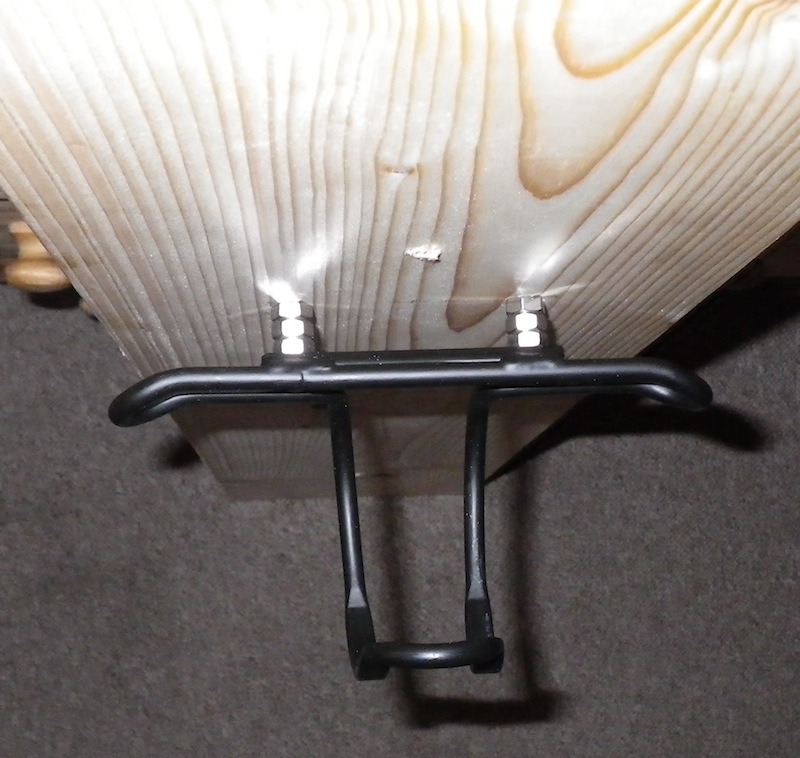 die "gurkenblüte" musste an die wand. die schweden haben für 2 € das paar passende Regalträger am start. fürs den 900+x mm MTB lenker definitiv zu kurz aber bis 45cm lenkerbreite seh ich da keine Probleme. gegen "kratzers" wurde die oberseite noch mit den resten der lauffläche eines alten schlauchreifens beklebt.