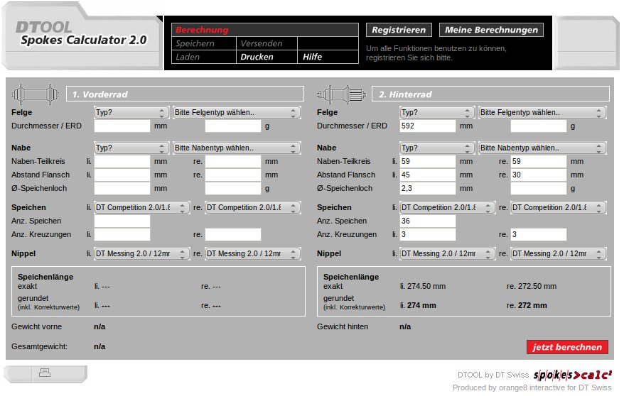 So, hab den DT-Speichenrechner jetzt doch mal zum laufen bekommen und das Ergebnis haengt davon ab, ob man beim Speichenlochdurchmesser ein 2,3 oder ein 2.3 eingibt - bob hat wohl ein 2,3 eingegeben.