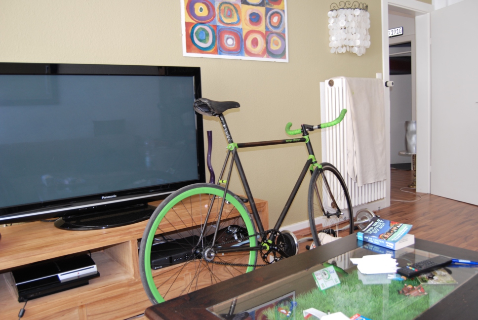 der gehoert nicht mir. Ist der von meinen "Vermietern". Wir leben halt alle mehr oder weniger Kommunenmaeßig zusammen. Mein Rad stand da nur weil ich grad nach Hause gekommen bin und es noch nicht aufgehangen hatte und ich hab dann halt die Kamera gegriffen und Fotos fuers Forum gemacht.
