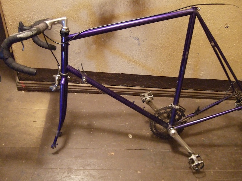 das lila sieht noch echt gut aus, und ist relativ dunkel, also nicht peinlich für tagesfahrten. am sitzrohr gibts ne runde abschürfung vom kryptonyte-schlosshalter (sieht man im bild), sonst wohl paar kratzerchen. steuersatz/innenlager laufen gut.